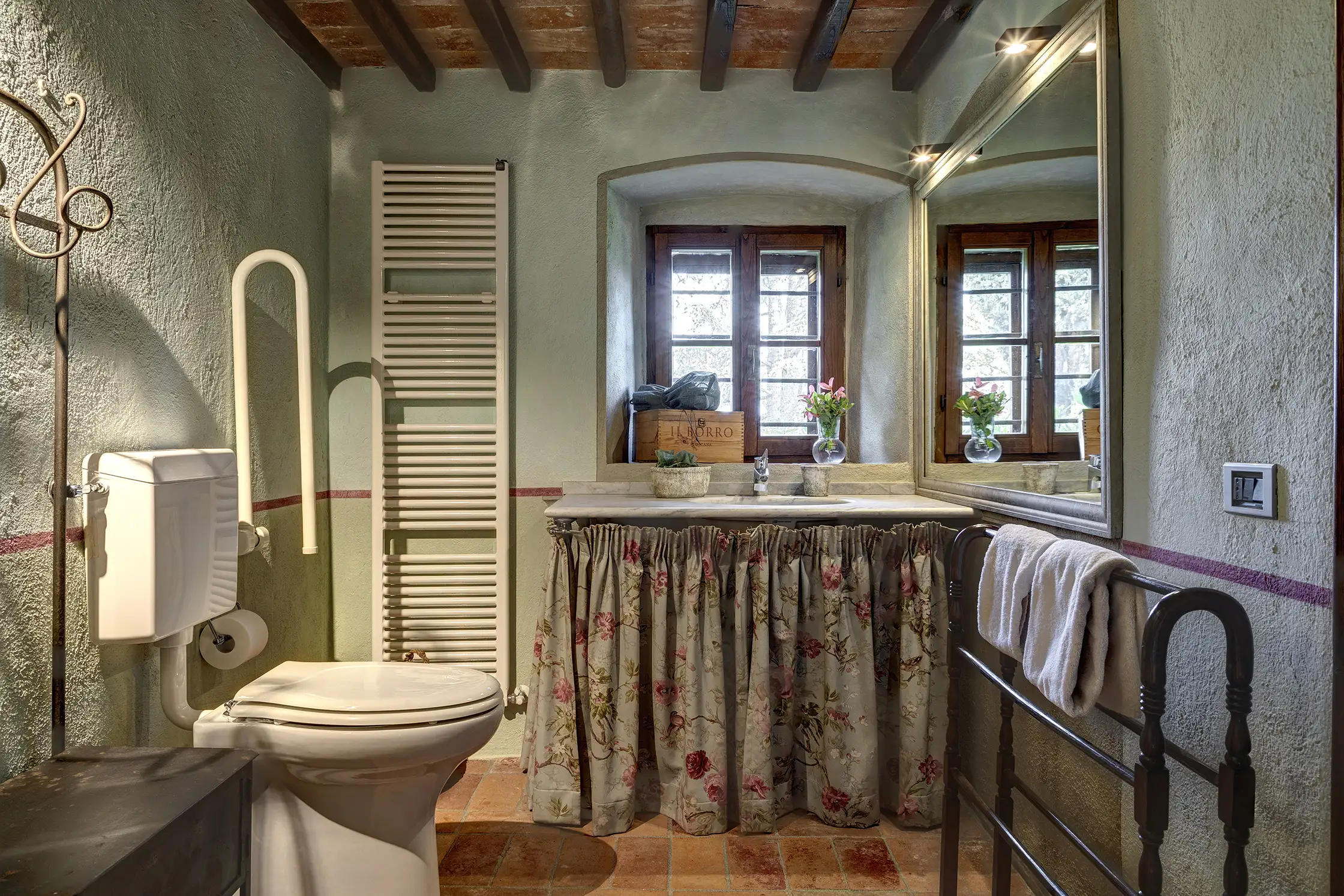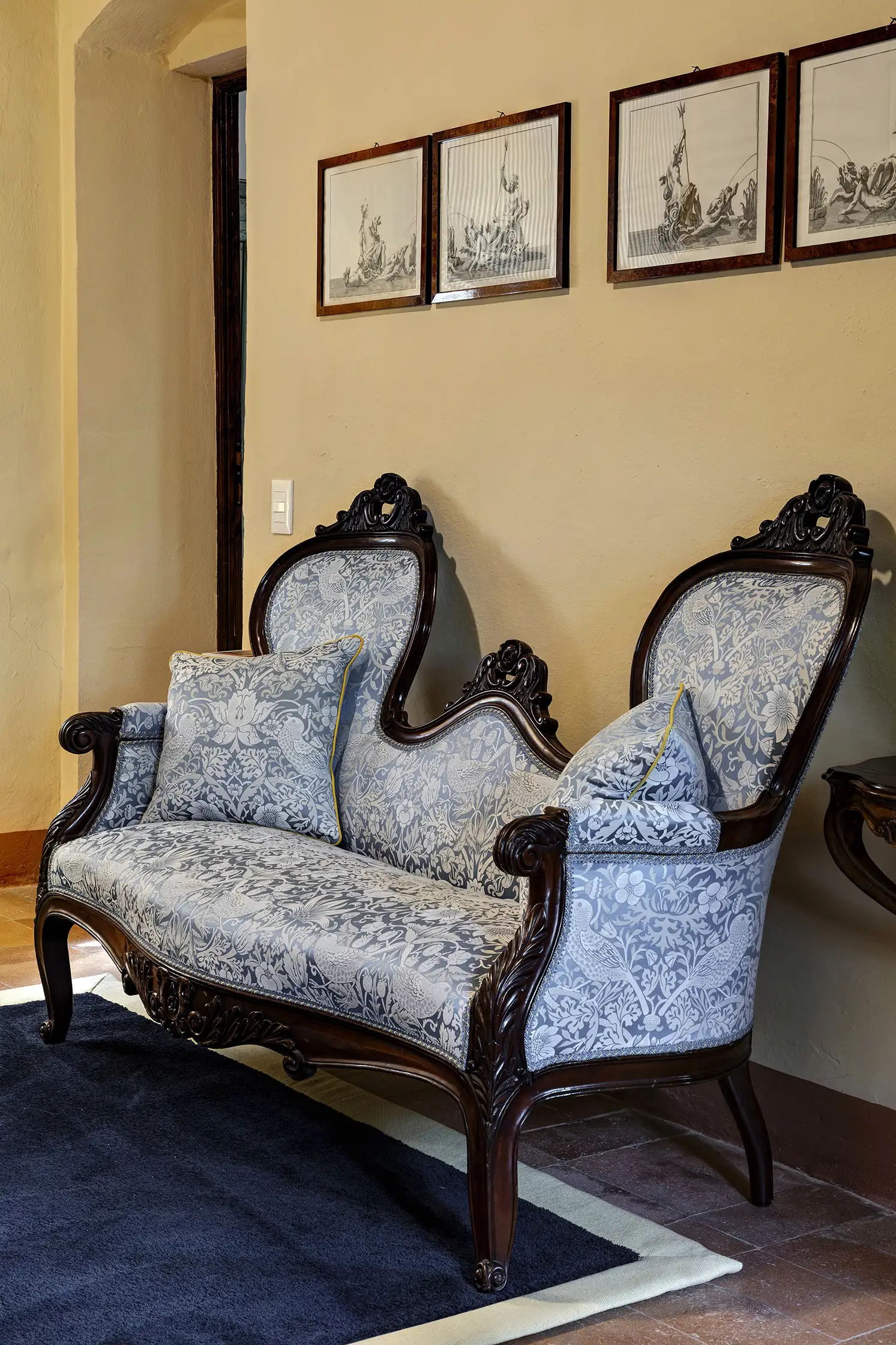 We were inspired once again by wine when naming this spacious suite. The Ricasoli family has existed for as long as Cà di Pesa, and the most notable, historical character created the recipe for Chianti. The suite sits in its own corner of the walled courtyard and has an independent entrance. It has a large bathroom on the ground floor, and then a curved staircase opens onto a living area on the 1st floor. From here you access the bedrooms. The first, a double with an exotic four poster bed and fascinating collection of antique luggage. Next door a comfortable twin room with its charming tromp d’oeil decoration featuring our own Chianti classico!