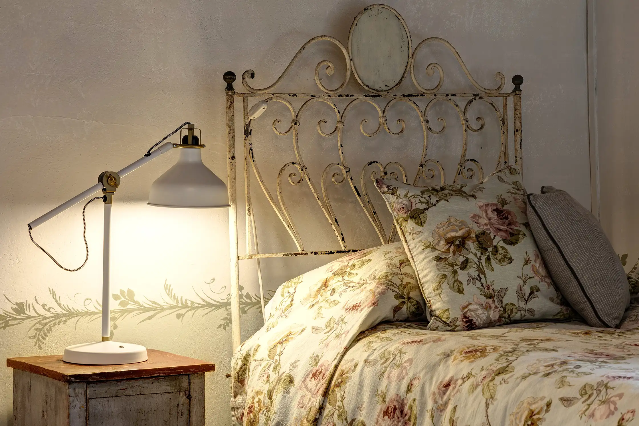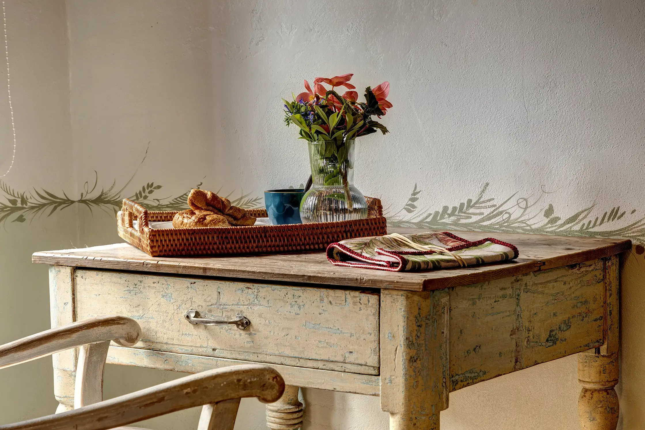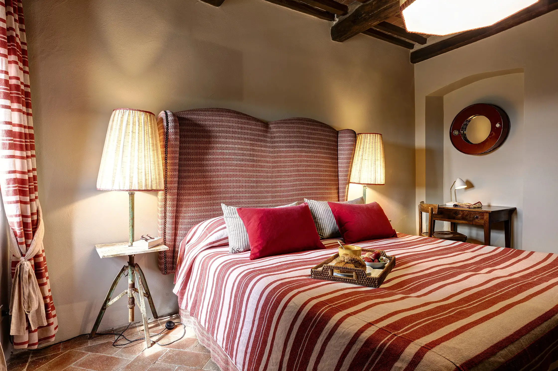 This charming family suite is tucked in off the first-floor landing. Tesoro, meaning treasure, named for its trompe d’oeil treasure chest hiding on a hand-painted wall behind one of the French, antique beds, shares a bathroom with Travaso. It just happens to have one of the most spectacular views in the house. The Travaso double room is imbued with red-coloured fabrics and warm toned wood which inspired the wine themed name, Travaso, which means to decant.